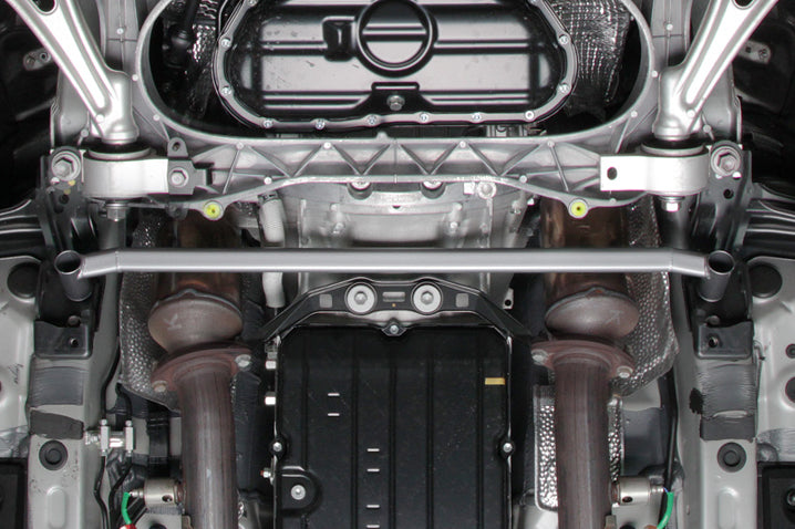By connecting suspension member L/R attaching point with oval-shaped bar, this increases suspension member fitting stiffness and body stiffness. Compatible with genuine Y shaped brace
