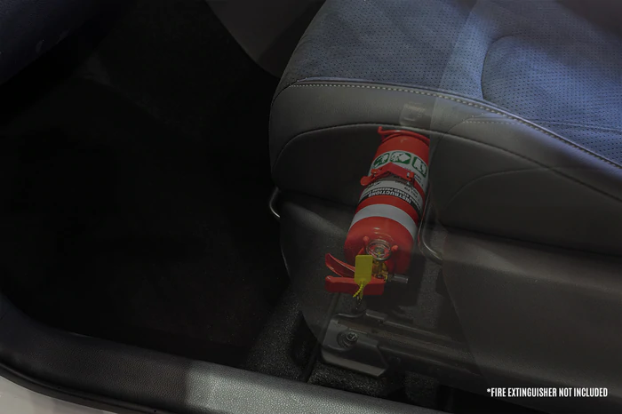 Made from black powder-coated 3mm thick stainless steel, the GR Yaris fire extinguisher bracket fits discreetly under the seats using the OEM mounting locations with no drilling required. We provide you with high-tensile mounting hardware, so if your ambition exceeds your ability or if you have a crucial moment, your extinguisher is located securely and in easy reach.