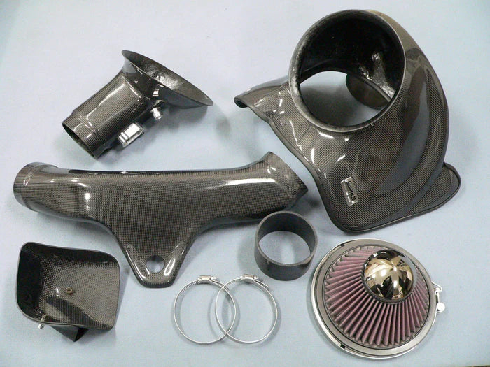 This beautifully handcrafted high-capacity RAM AIR SYSTEM, also known as cold air intake (CAI), makes full use of the engine bay drawing in the greatest amount of ambient air available. The carbon fiber filter case prevents heated air from entering intake stream lowering intake temperature increasing horsepower and torque throughout the power band. Producing a sharp, crisp boost in performance revealing a truly sporty sound at high rpm delivering power, elegance, unsurpassed fit and finish with simple bolt-on installation.