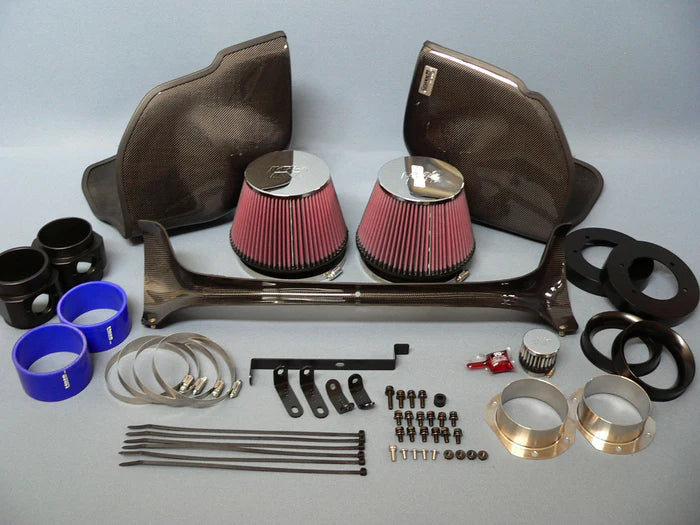 This beautifully handcrafted high-capacity RAM AIR SYSTEM, also known as cold air intake (CAI), makes full use of the engine bay drawing in the greatest amount of ambient air available. The carbon fiber filter case prevents heated air from entering intake stream lowering intake temperature increasing horsepower and torque throughout the power band. Producing a sharp, crisp boost in performance revealing a truly sporty sound at high rpm delivering power, elegance, unsurpassed fit and finish with simple bolt-on installation.