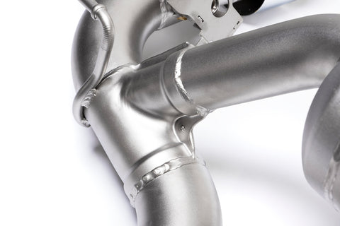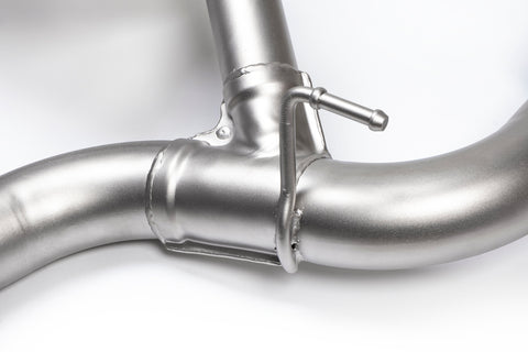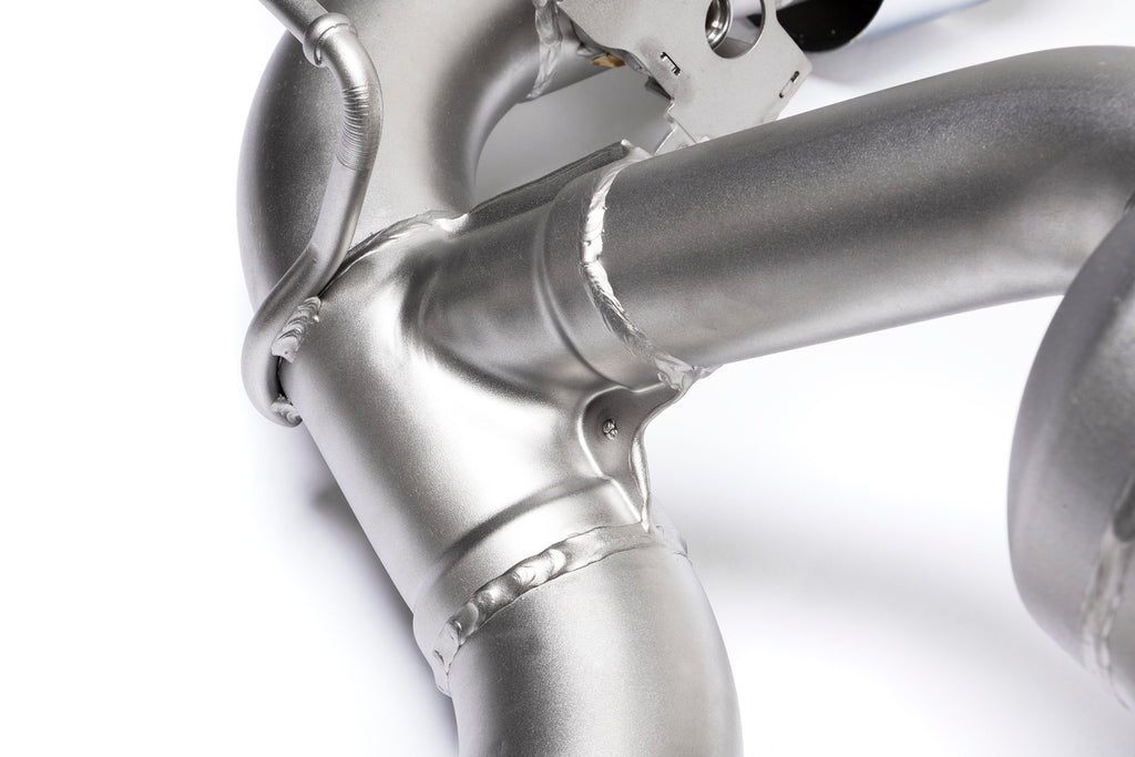 consisting of a sport exhaust centered for L/R system with one integrated valve and one tail pipe (Ø 115 mm) on each side. The tail pipes are cut diagonally with a straight cut. The tube surface is chromed and branded with a laser engraved logo.