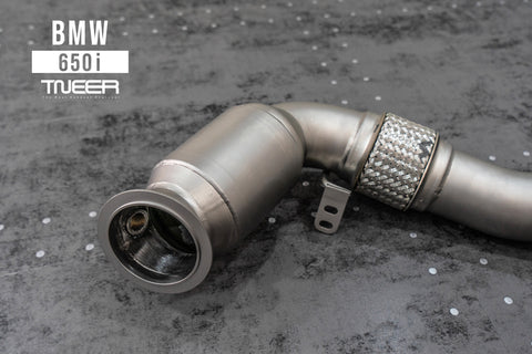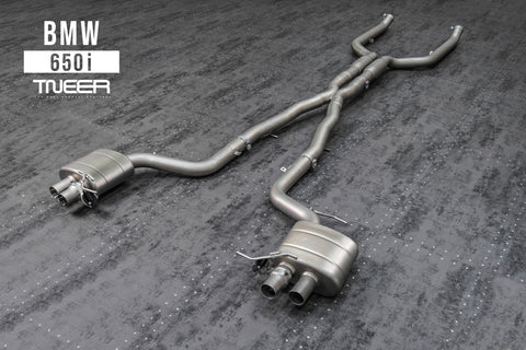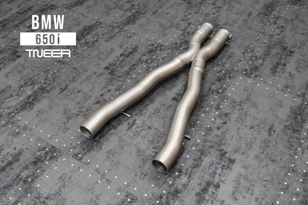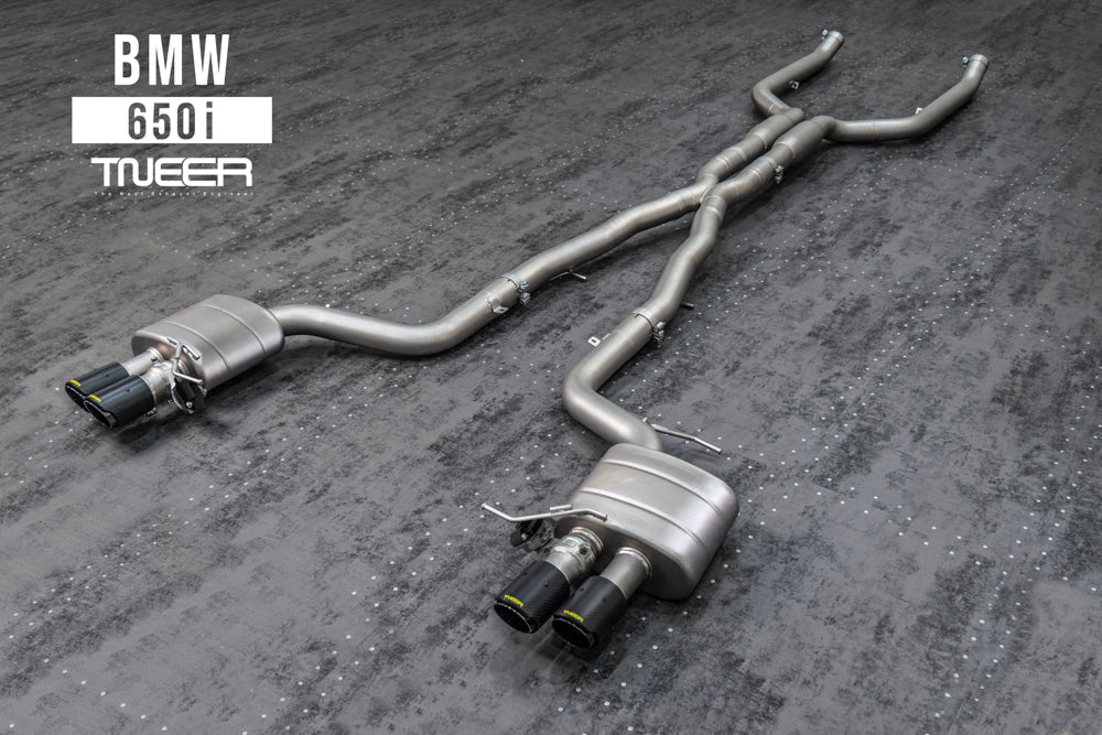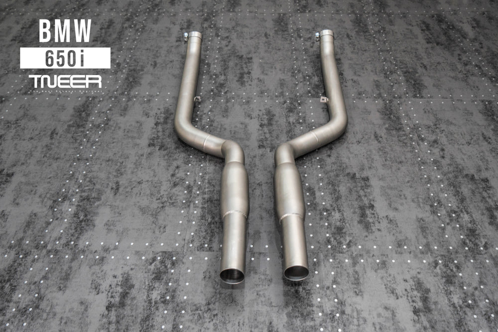 Stand out with this incredible TNEER Front Pipe + Mid Pipe + Rear Mufflers (Valvetronic) + Quad Silver Tips for BMW 650i F06 / F12 / F13 (N63). (Years: 2011 - 2018)