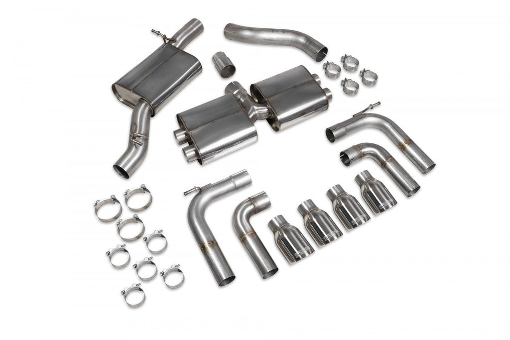 Manufactured from premium 80mm/3.14” T304 Stainless Steel the CNC Mandrel bent large bore design permits maximum performance by allowing a greater flow of gases. Available options are resonated valved, resonated non-valved, non-resonated valved and non-resonated non-valved. Valved - which uses the original motor and can be operated by the driver with the drive mode select button inside the car. There is also a non-valved which deletes the valve completely for a continuous sportier tone.