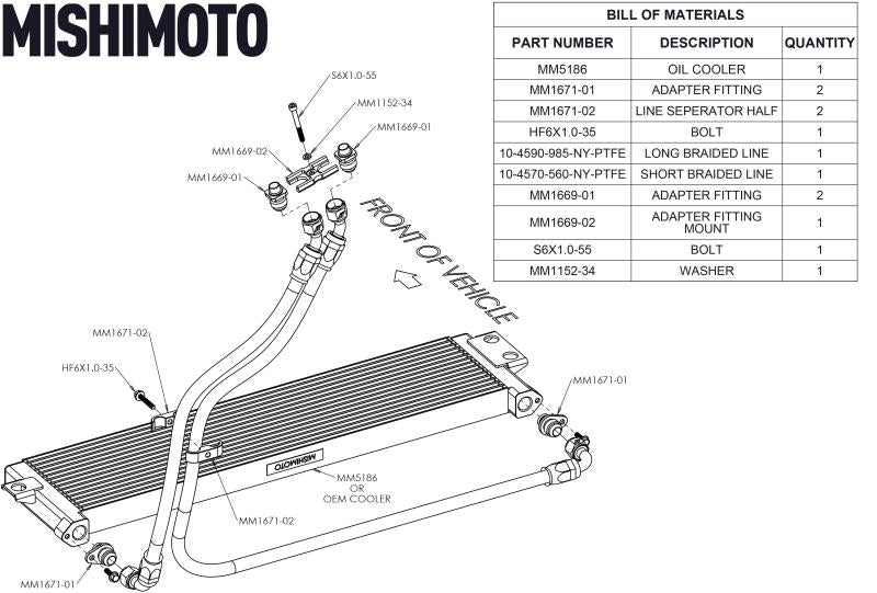 Oil Cooler--1ft, 10in Nylon Braided hose with 45 and 70 -10AN Fittings--3ft, 3in Nylon Braided Hose with 45 and 90 -10AN Fittings--MMOCF-F80--Application Specific Oil Cooler Adaptors--Braided Line Separator Bracket--Mounting Hardware--Mishimoto Lifetime Warranty