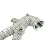 The Black Mamba decat downpipes, made from high-quality stainless steel, in 3.5" (89mm) to dual 2.75" (70mm) diameter, fit without modification between the turbo and the secondary catalysts of the 2.5 TFSI engines in the Audi TTRS 8S and RS3 8V Facelift, removing the main catalyst.