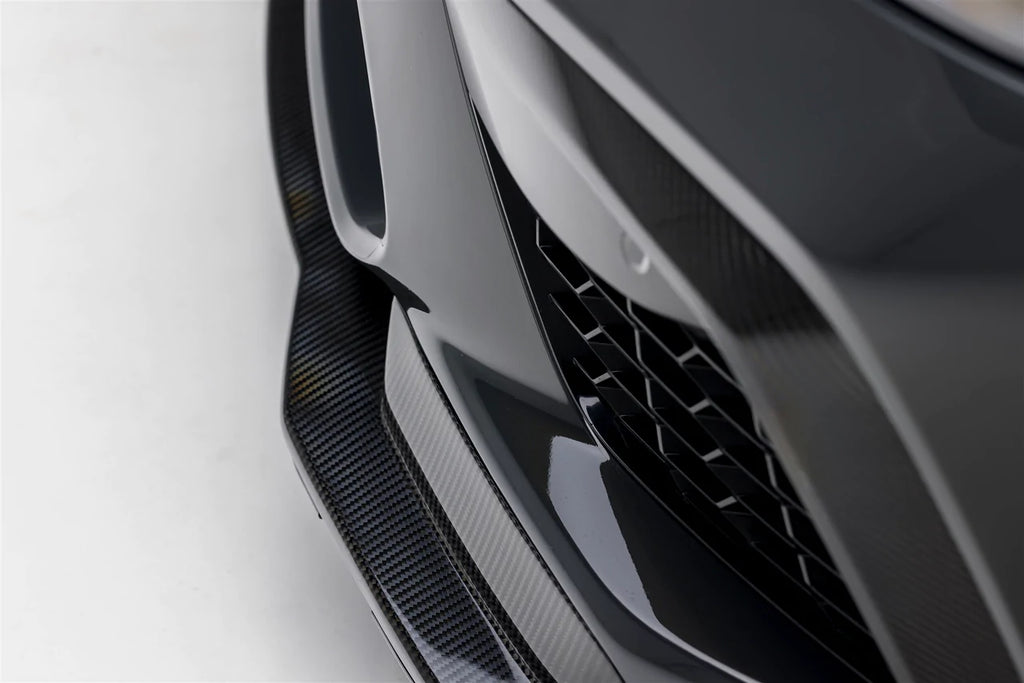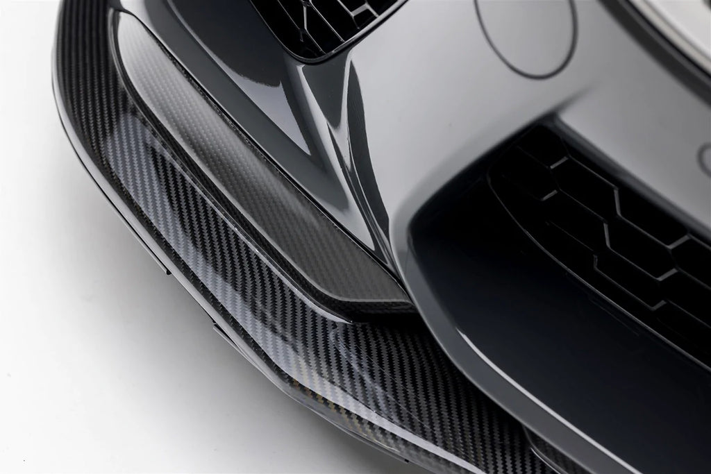 Our 2x2 weave, carbon fiber front spoiler enhances the original appearance of the OEM front bumper while providing functional aerodynamic upgrades.