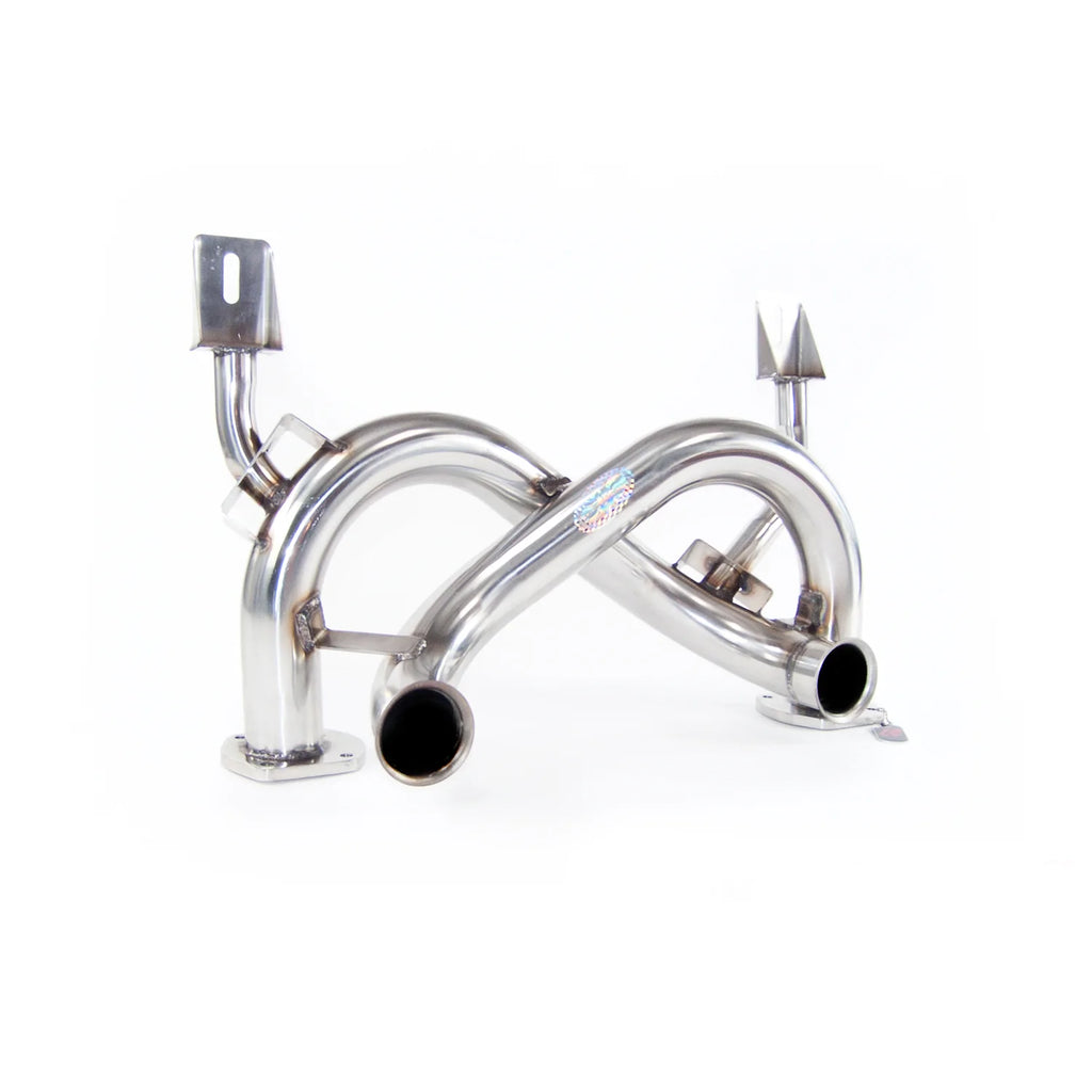 The system replaces the enormous and heavy factory rear muffler with a tubular straight through cross over design which retains all the bosses for the sensor probes.