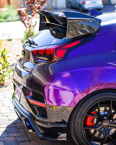 The Hyundai Veloster N rear wing was already pretty aggressive for a wing that came from the factory on a hot hatchback. But the ADRO V2 carbon fiber rear spoiler for the Hyundai Veloster N takes that aggression to a new level. This new rear spoiler will completely transform the look of your car while still integrating the beloved triangle third brake light. The spoiler rises higher than the factory wing, is made from handcrafted real carbon fiber, and is arguably the most aggressive spoiler currently available for the Veloster.