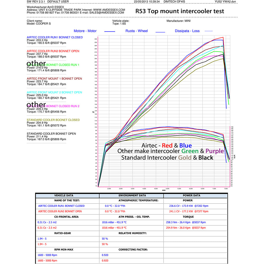 AIRTEC Test Results – Tim’s 233.3 bhp (AIRTEC cooled) Tuned Mini R53 at AMD Tuning rolling road 10th May 2013 – note, results below were with bonnet closed on every run.