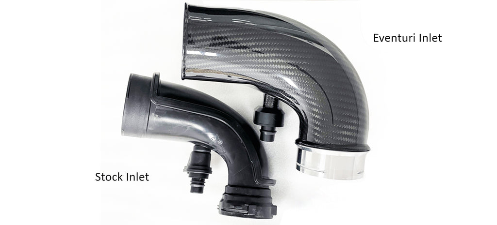 Presenting the perfect addition to our F90 M5 intake system to optimise the flow path all the way to the turbos. Our carbon inlets have a larger volume than the stock inlets by maintaining a larger diameter all the way to the turbos. The stock inlets narrow down immediately after the connection to the intake which creates a restriction, especially at higher boost levels. We have alleviated this restriction and also designed the curvature to be as smooth as possible allowing the turbos to reach peak boost sooner.