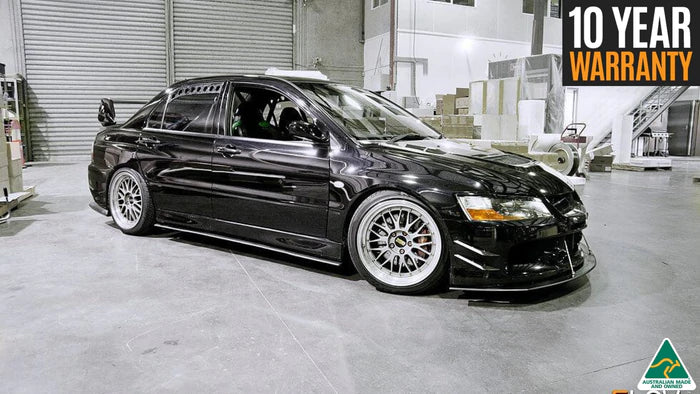 Flow Designs offer side skirt extension splitters for CT9A Evo (7/8/9), in addition to front lip splitters for Evolution VIII & Evolution IX. These splitters are the strongest on the market guaranteed, backed by our Strong As F 10 year warranty. Easy installation onto the bumper/factory lip which can be performed with simple hand tools with instructions provided, making it a perfect DIY project!
