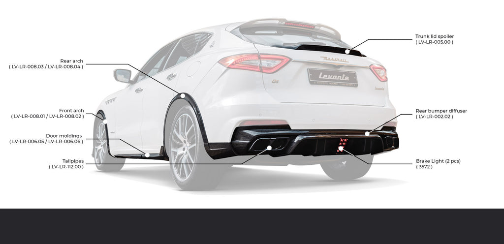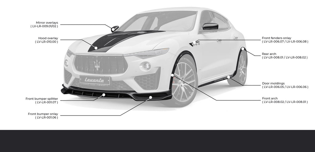 Every component of that body kit is made of tested and certified by TUV in Germany. That kit can be made of either carbon fiber or composite material with a 2-year warranty. The kit fits to Maserati Levante 2018-2020 models.