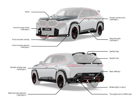 LARTE Performance body kit by LARTE Design for the BMW XM, XM Label Red, and XM 50e models of the G09 lineup from 2022 to 2024. This is the very first kit for this unique car series, limited to only 500 in the world. It is available to buy in Luxury, Sport, Technology, and M Performance trims. Our XM body kit includes a 100% carbon fiber hood with a rainwater drainage system, a powerful sport diffuser with carbon fiber trim for the exhaust system, and an aggressive lip with a dynamic splitter for the BMW XM, transforming its exterior appearance and making it unique. Each component of the LARTE Performance body kit for the 2023 BMW XM is handcrafted at Larte Design's own state-of-the-art facility. You can choose the material and color of the LARTE Performance body kit for the BMW XM, including 100% German-made carbon fiber or premium-class composite materials, available in glossy black or body-matching colors such as M Black Carbon Metallic, BMW Individual Urban Green Metallic, or Skyscraper Grey Metallic.