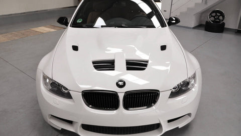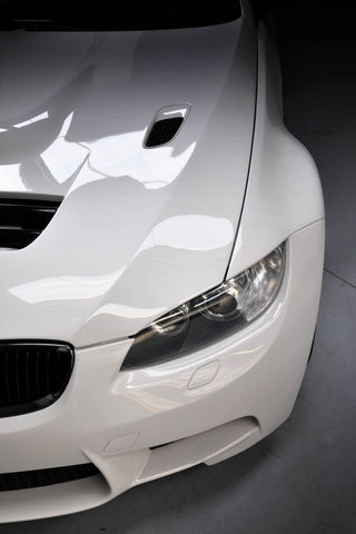 Note:  If your vehicle is a facelift model, the front bumper cannot be installed due to the changed headlights. The tailgate & roof spoiler is only suitable for e92 Coupé models. In vehicles with PDC, recesses in the bumper must be prepared to mount the PDC sensors. In vehicles with an existing SRA, the existing headlight cleaning system can be adapted into the front bumper. To do this, the cutouts must also be cut out and the headlight cleaning system glued into the front bumper. Ideally, you take over almost the entire interior of the original series front bumper. The cutouts in the fenders are the same as the original M3 fenders, so ideally original BMW M3 gills/indicators are to be used. It is also important to note that the original washer fluid tank must be replaced with a smaller original M3 washer fluid tank. In convertible models, the control unit located under the fender must be moved. To assemble the bonnet, the original hinges of the standard bonnet must be adopted. The insulation mat can be left out in the area of ​​the front air intakes. The air intakes on the right and left are identical to those of the original M3 bonnet, so the original BMW M3 air intakes should ideally be used. When using a standard / not M3 style exhaust system, small adjustments to the ESD or the rear bumper may be required. Depending on the exhaust position, this can be appropriately left out by the buyer. An assembly of fog lights is not intended as with the original BMW M3. These can be adapted into the front bumper by fog lamp mounts if desired. If fog lights were previously available and should no longer be installed, these can be deactivated by BMW via the software if an error message appears or can be blended using a resistor.