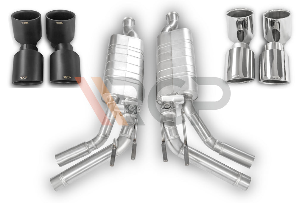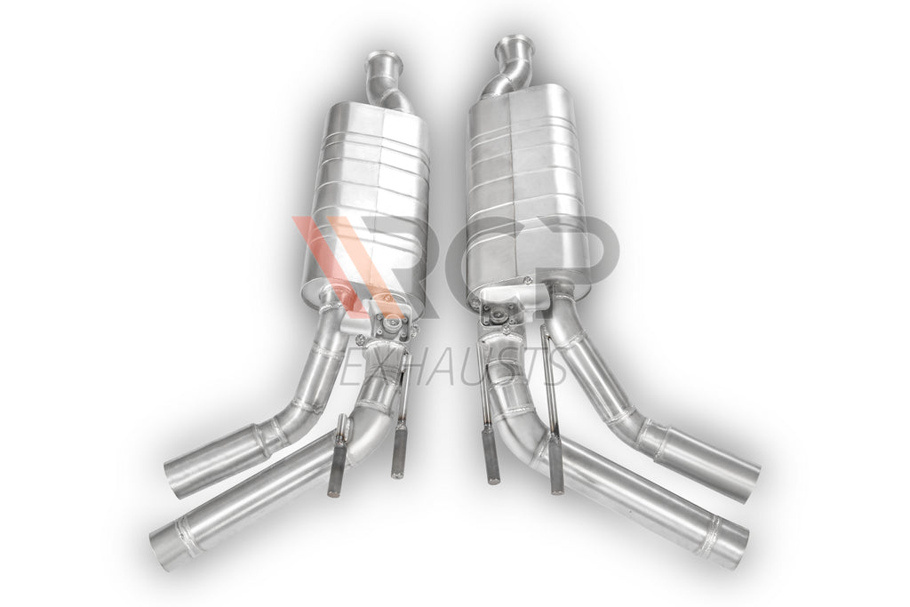 Cat-Back for Mercedes G63 AMG developed by RCP Exhausts contains two rear (side) mufflers with valves working with factory valve motors. There are two types of tailpipes: polished silver (standard) and satin black (additional charge).