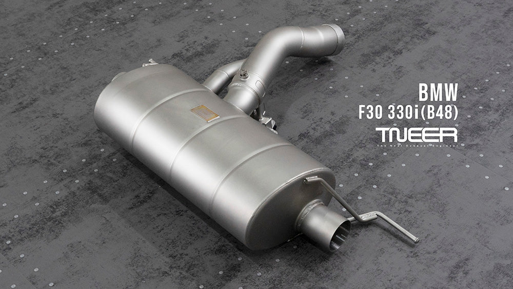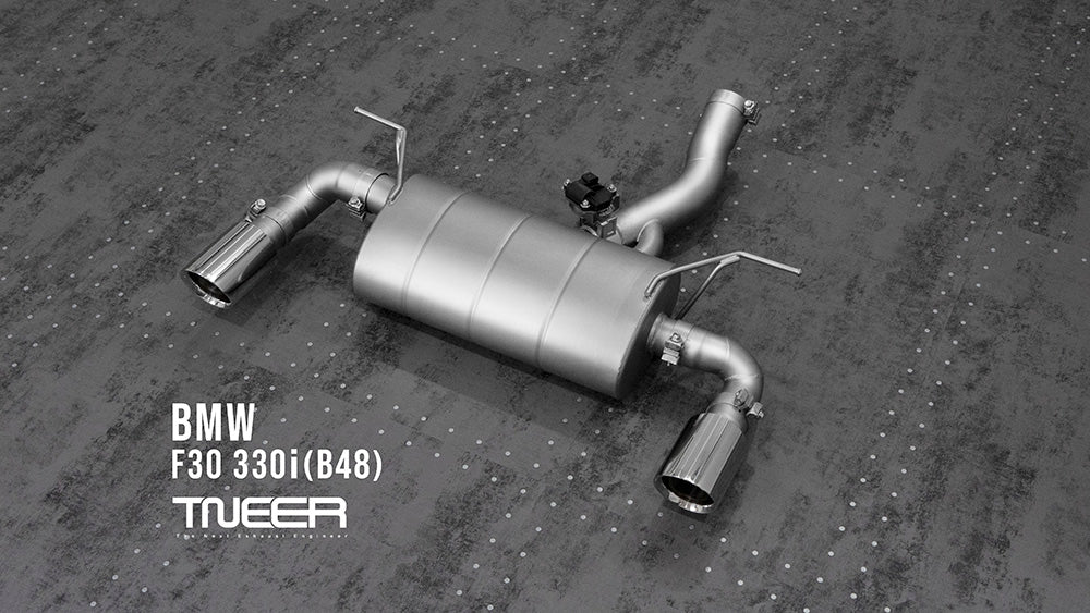 Stand out with this incredible TNEER Front Pipe + Mid Pipe + Rear Mufflers (Valvetronic) + Dual Silver Tips for BMW 330i F3X (B48). (Years: 2011 - 2019)