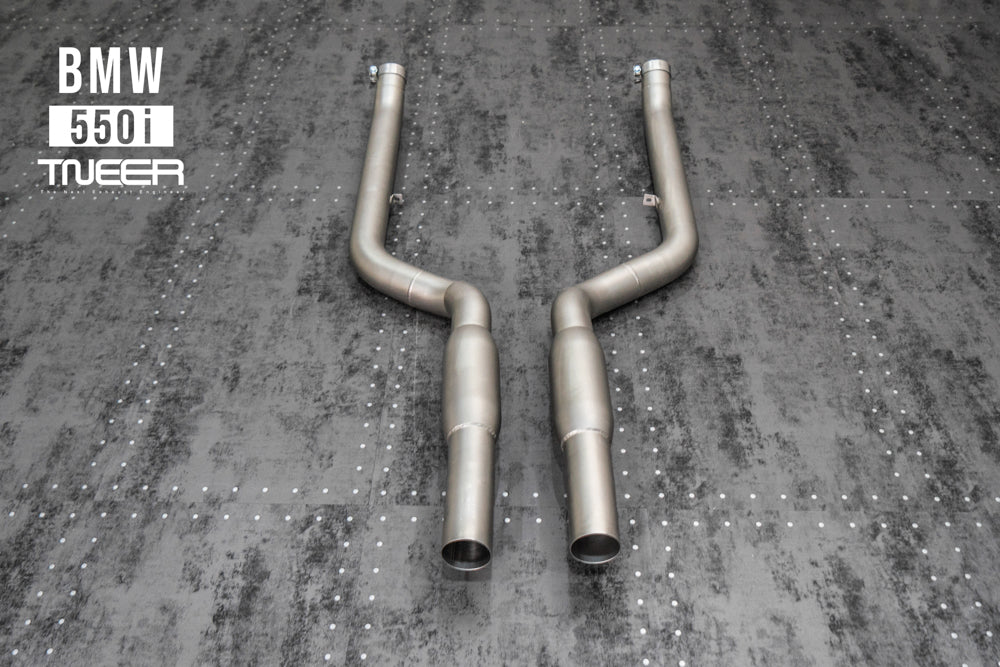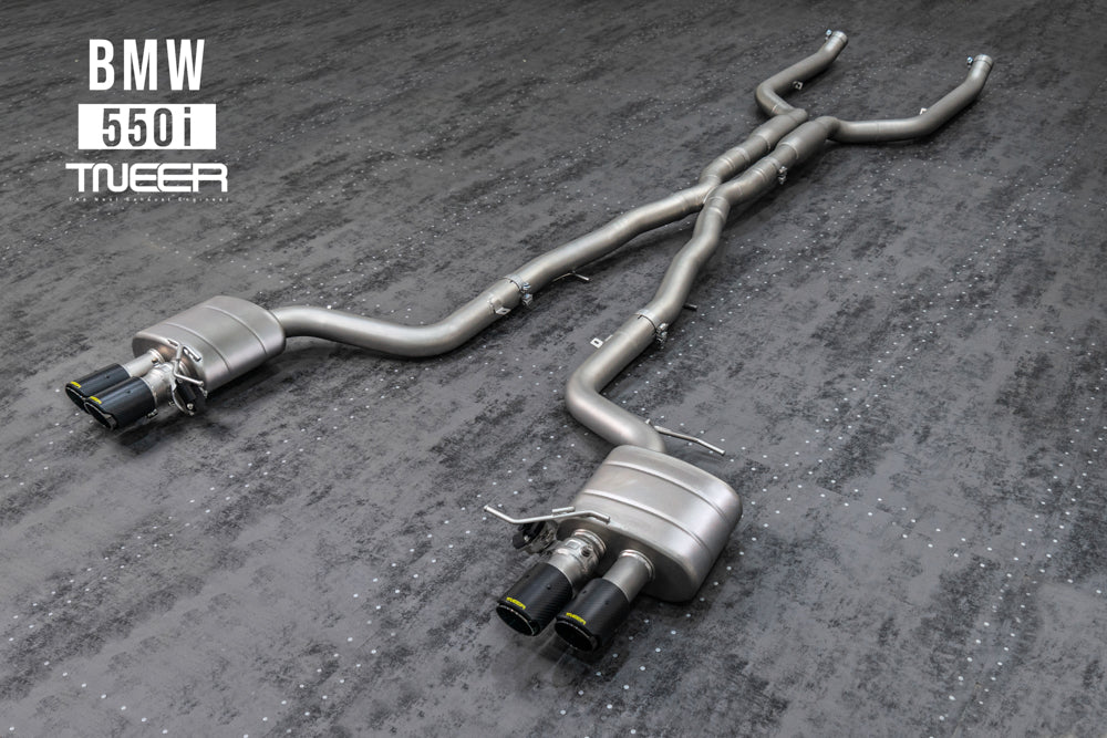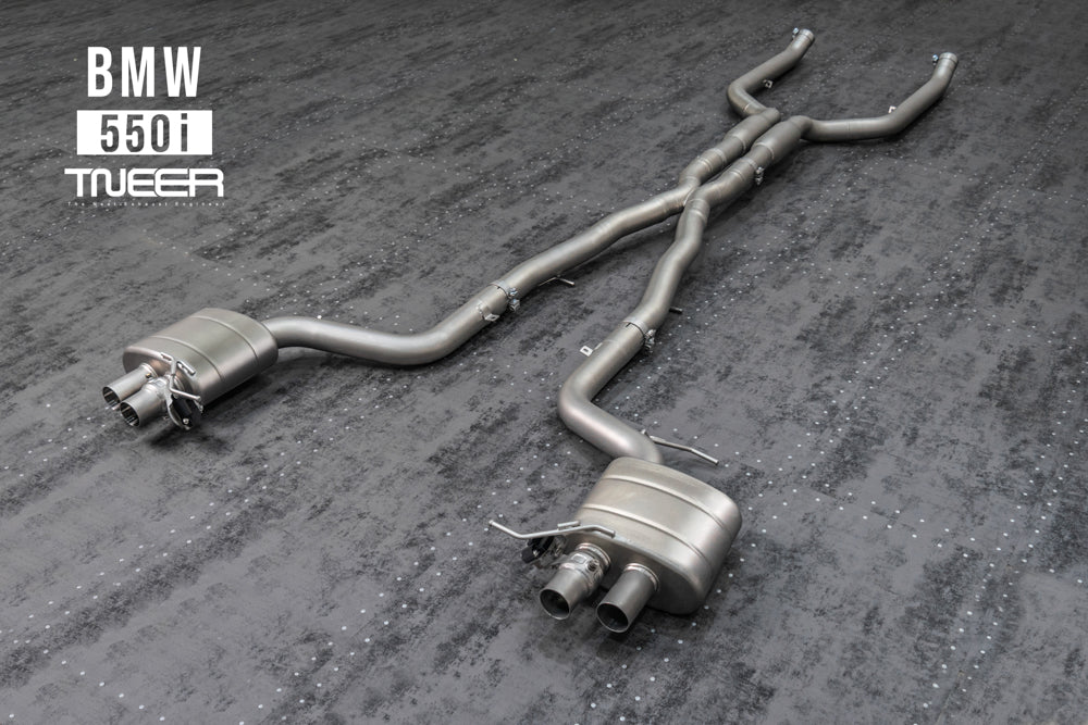 Stand out with this incredible TNEER Front Pipe + Mid Pipe + Rear Mufflers (Valvetronic) + Quad Silver Tips for BMW 550i F10 / F11 (N63). (Years: 2010 - 2016)