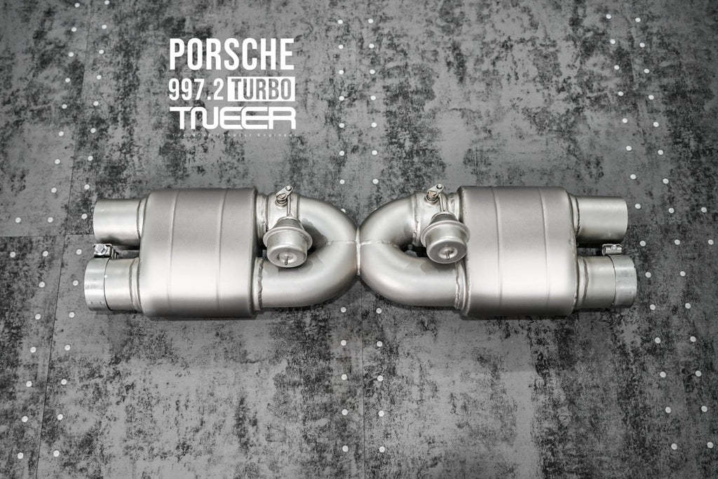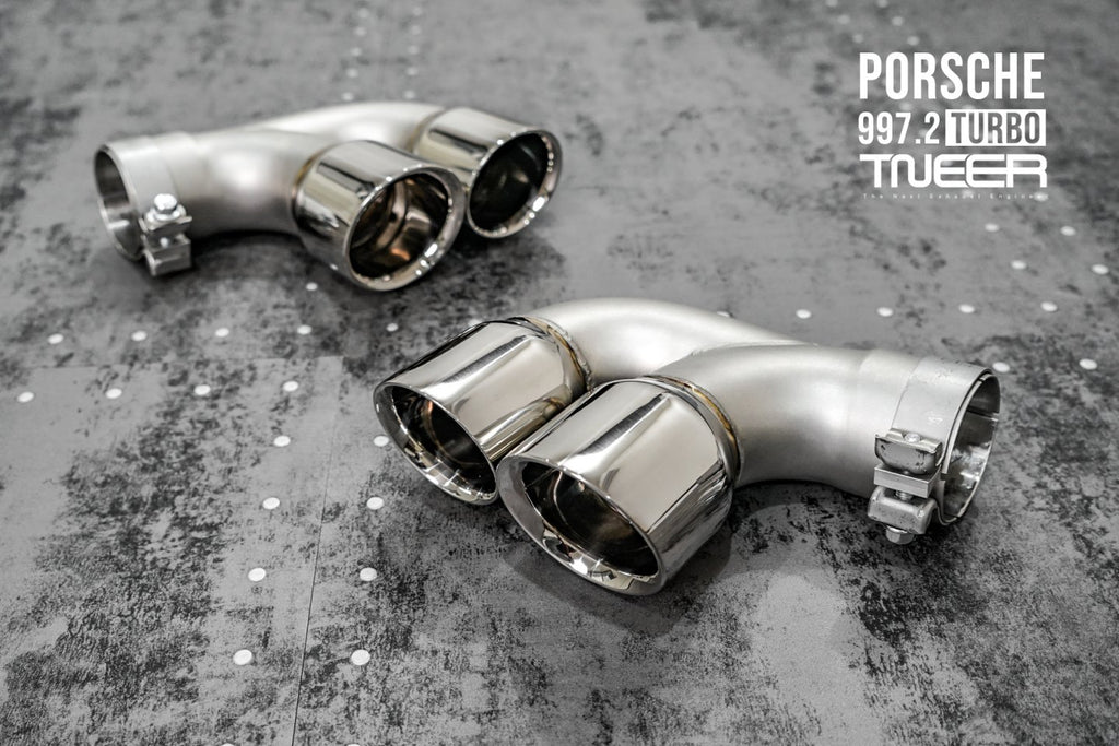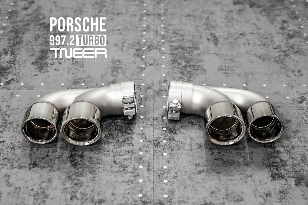 Stand out with this incredible TNEER Catless Mid Pipe + Rear Mufflers (Valvetronic) + Quad Silver Tips for Porsche 997.2 Turbo / S. (Years: 2005 - 2012)